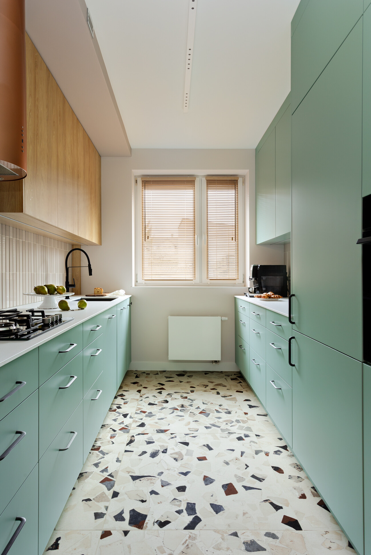 Na parterze zlokalizowane są: kuchnia, łazienka, jadalnia / pokój dzienny, sypialnia i pokój dziecięcy. Przestrzeń wypoczynkowa będzie znajdowała się na piętrze domu. Wcześniej oba poziomy funkcjonowały jako osobne mieszkania. Moim zadaniem było również zaprojektowanie korytarza i klatki schodowej tak, aby były nie tylko wygodnym miejscem do rozebrania się po wejściu do domu, ale także wizualnie i materiałowo łączyły oba poziomy.