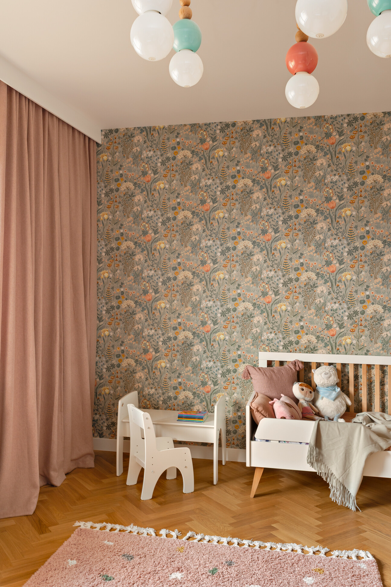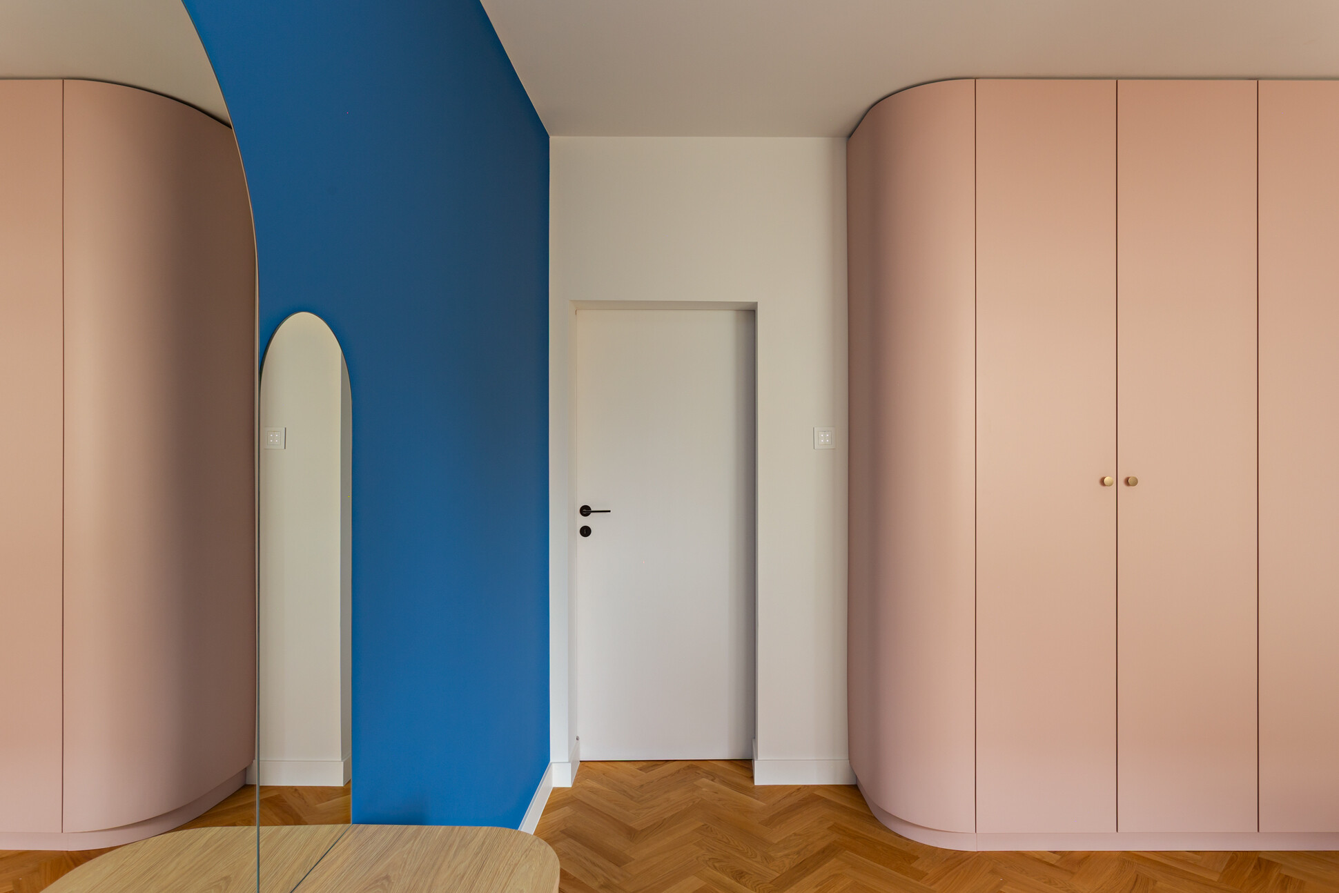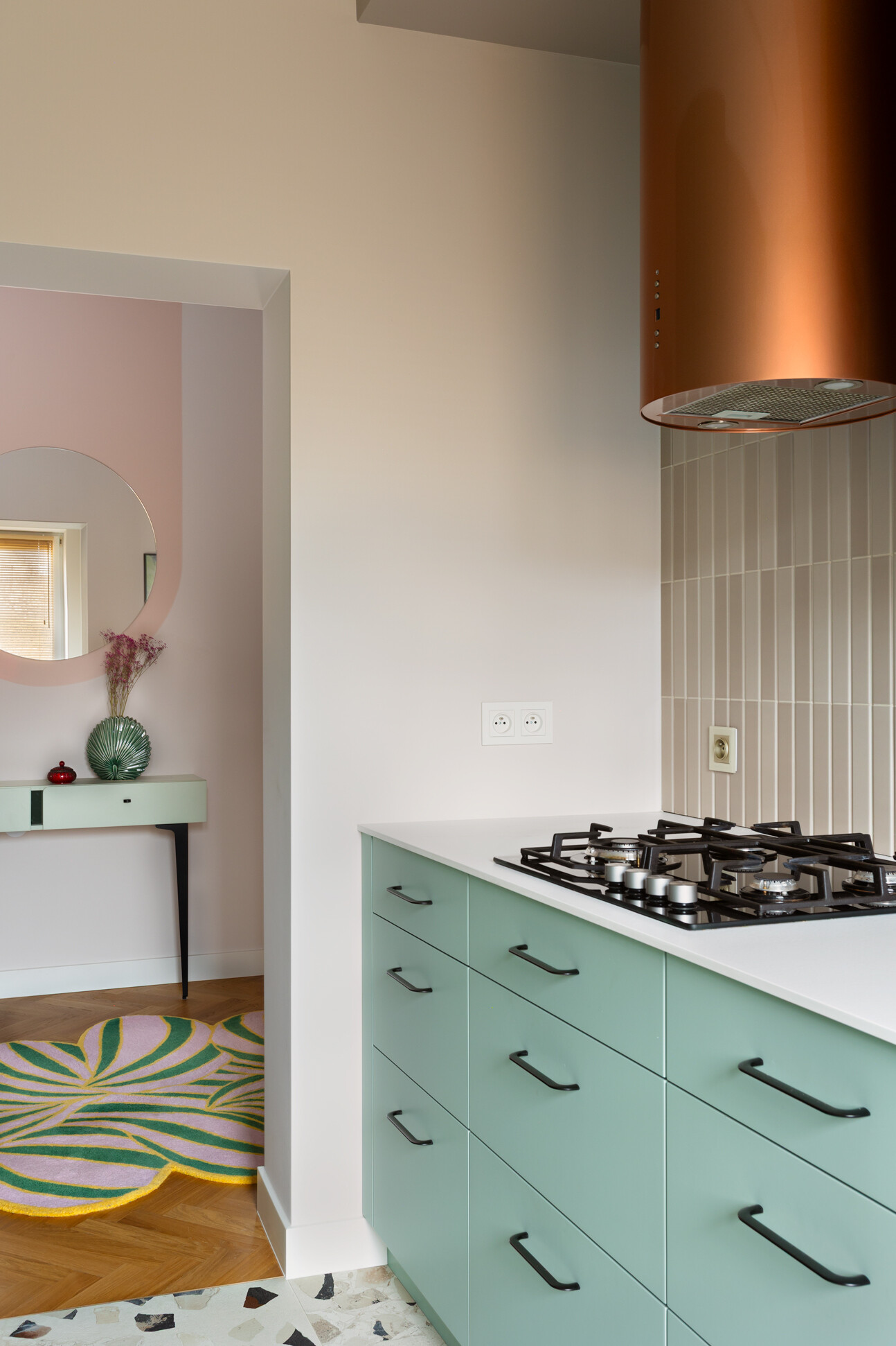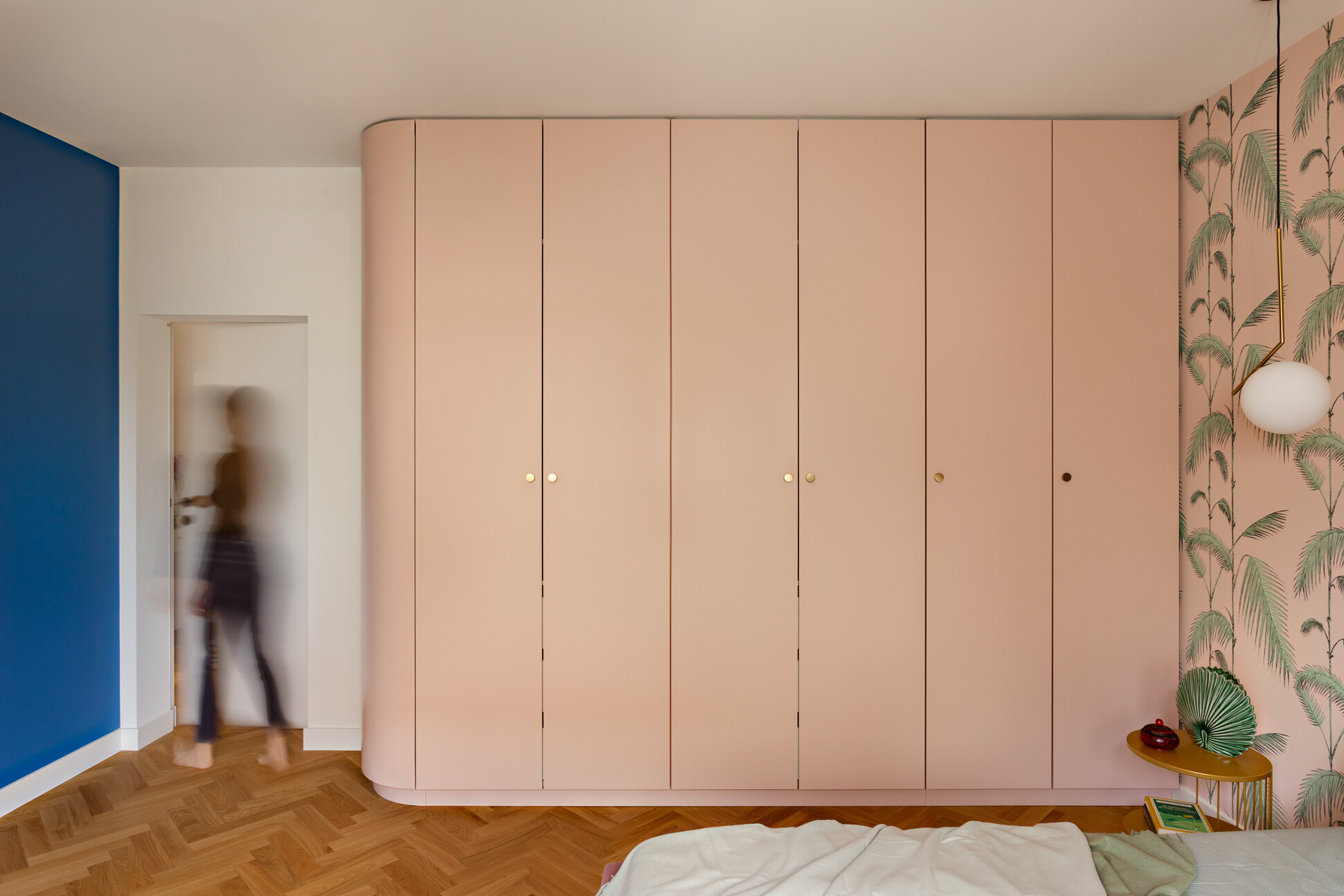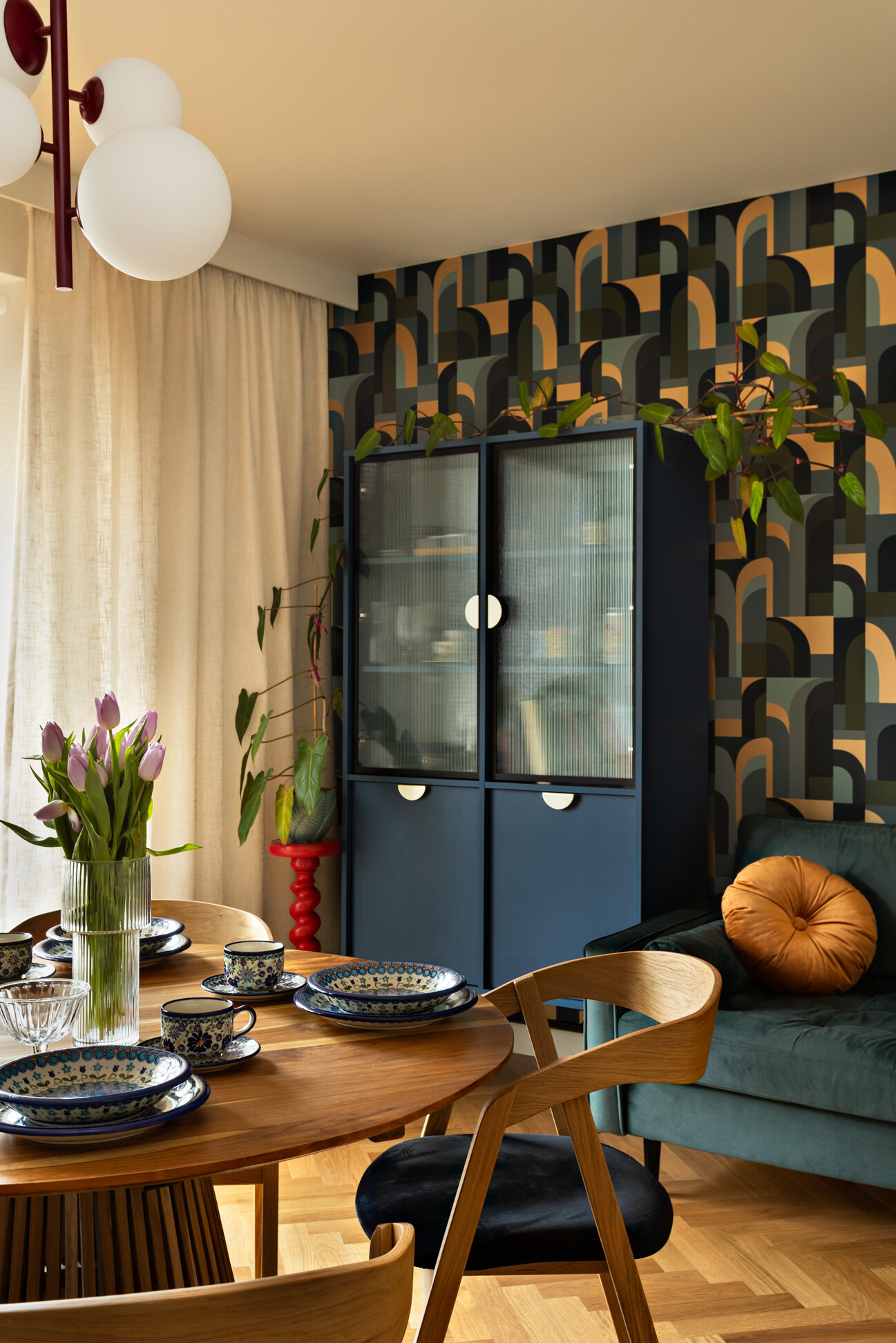 Wyróżnikiem tej realizacji są wzory, które konsekwentnie pojawiają się we wszystkich pomieszczeniach – w pokojach w tapetach i usłojeniu drewna, w kuchni w podłodze i rytmicznym rysunku płytek ściennych. Na podłodze w pokojach położono dębowy parkiet ułożony w jodełkę, który stanowi wyrazistą bazę materiałową dla aranżacji.