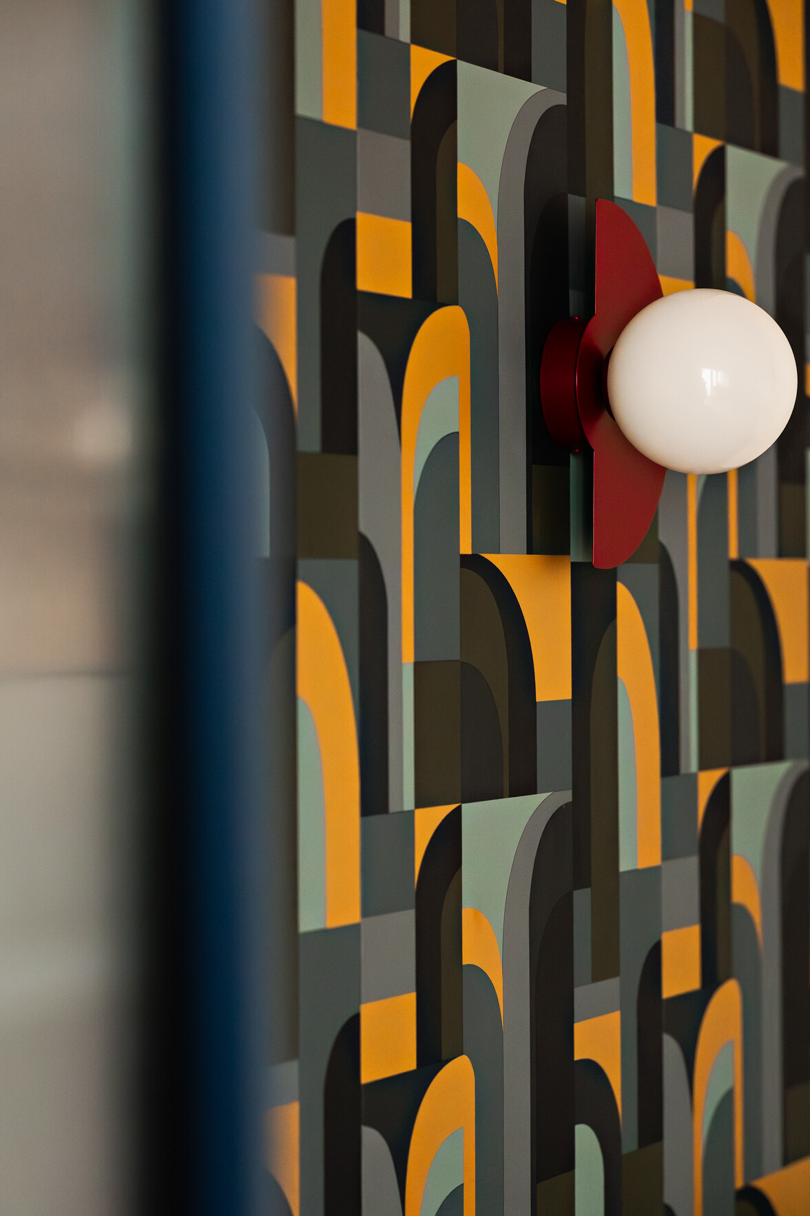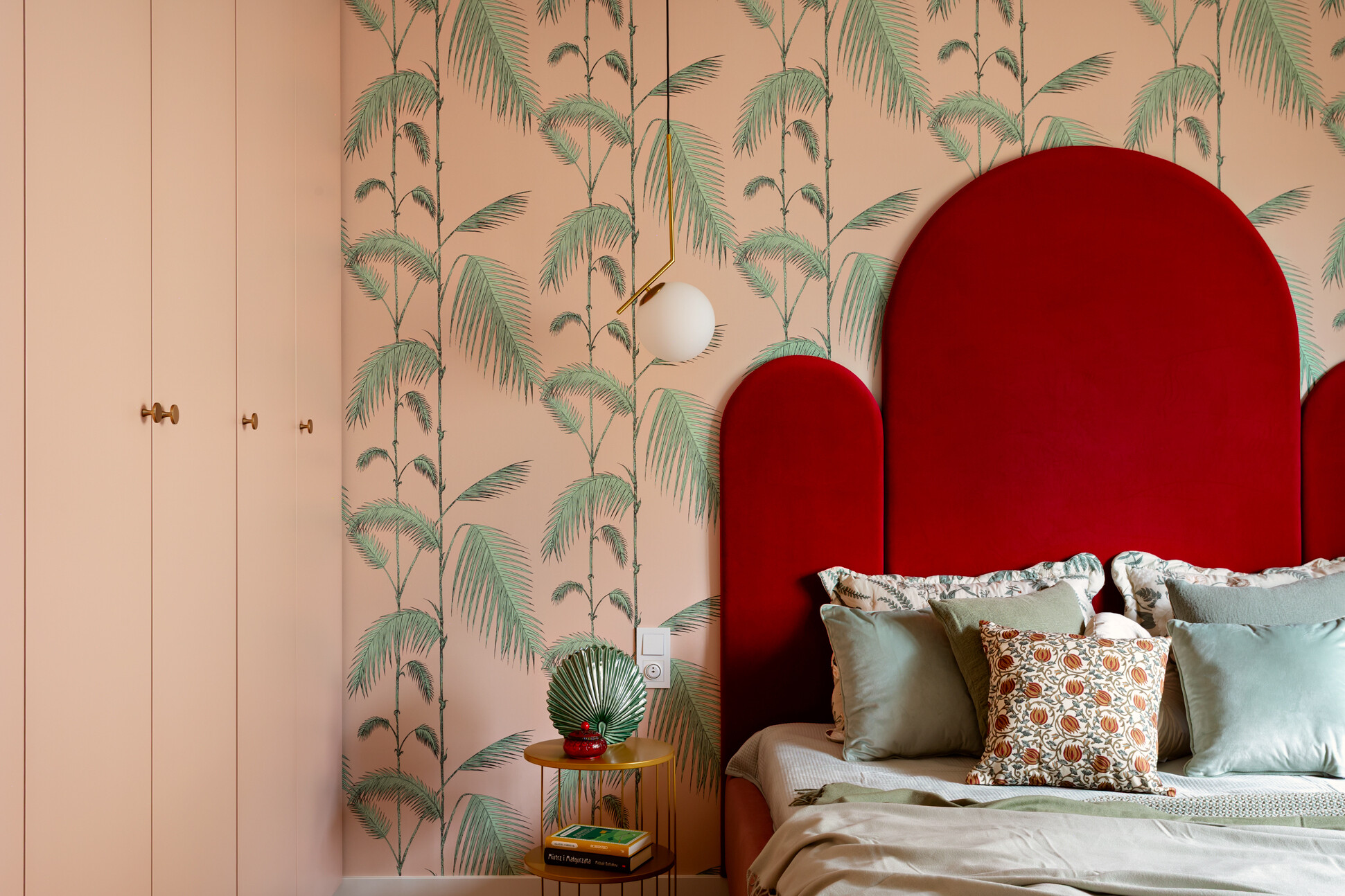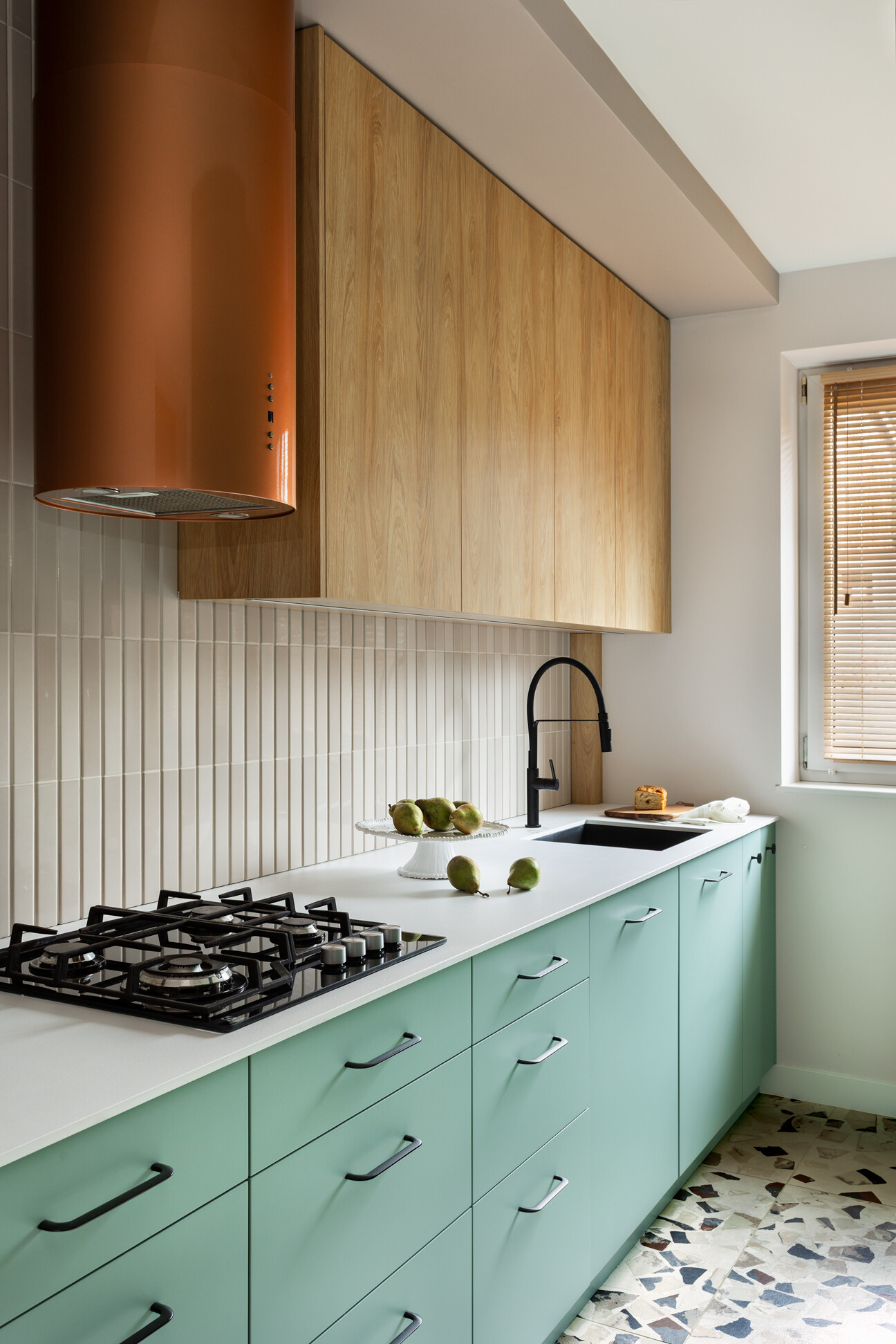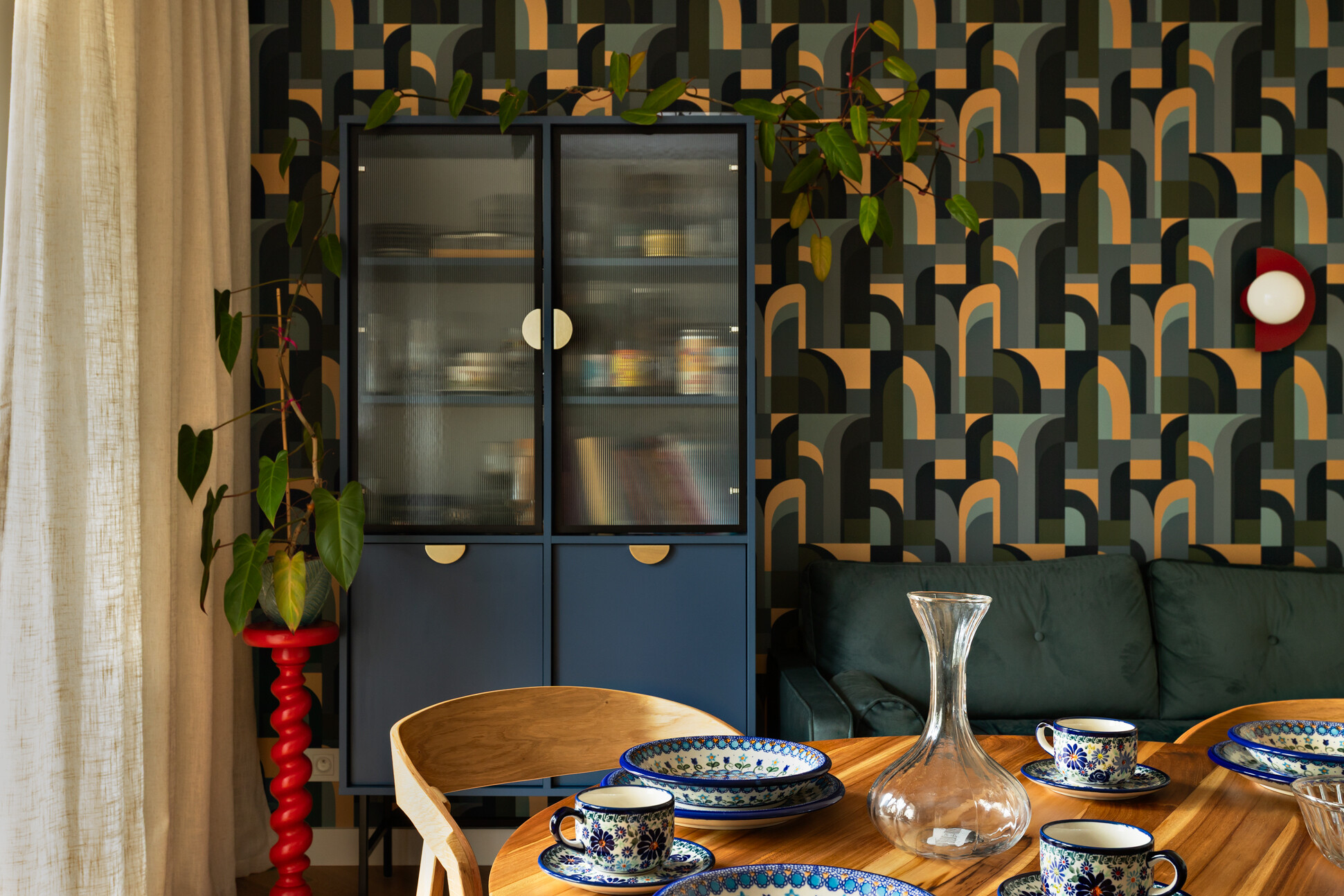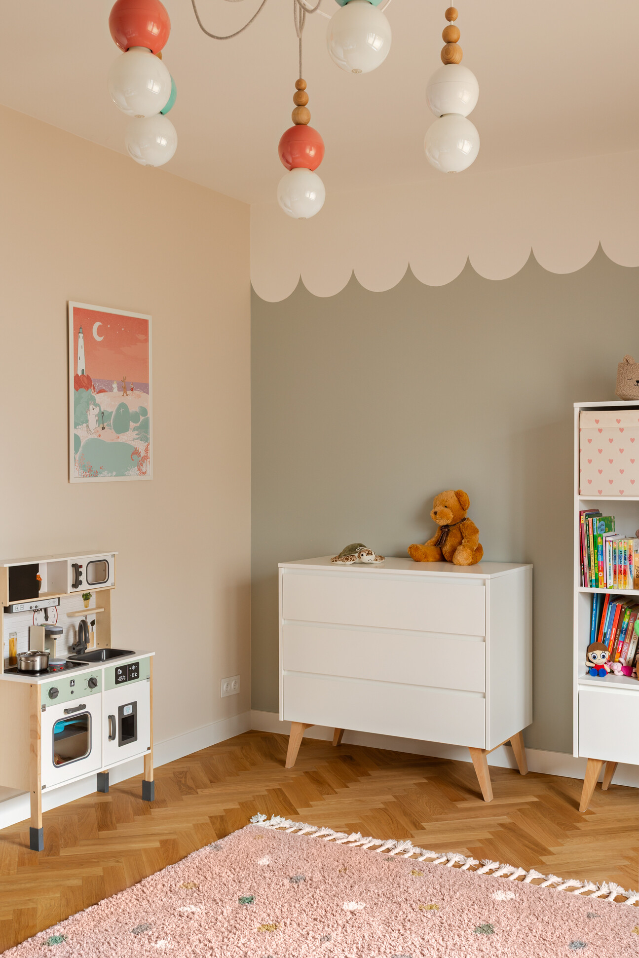 Wyróżnikiem tej realizacji są wzory, które konsekwentnie pojawiają się we wszystkich pomieszczeniach – w pokojach w tapetach i usłojeniu drewna, w kuchni w podłodze i rytmicznym rysunku płytek ściennych. Na podłodze w pokojach położono dębowy parkiet ułożony w jodełkę, który stanowi wyrazistą bazę materiałową dla aranżacji.