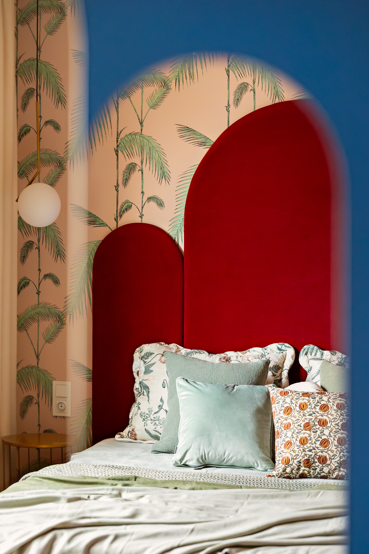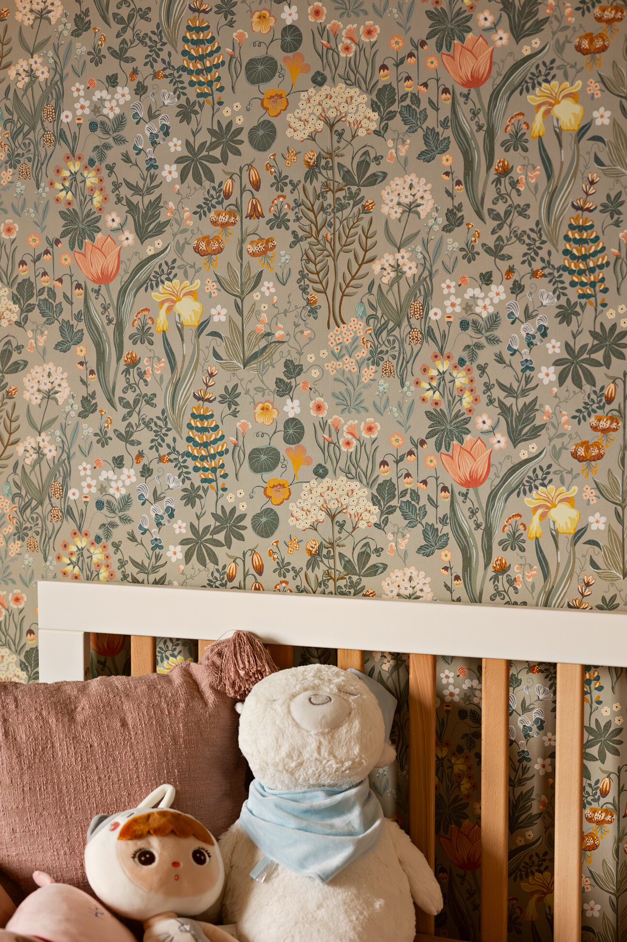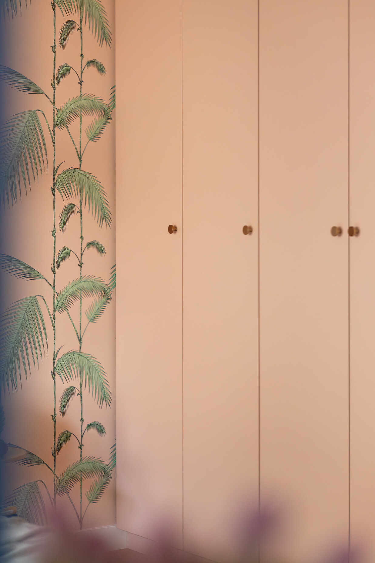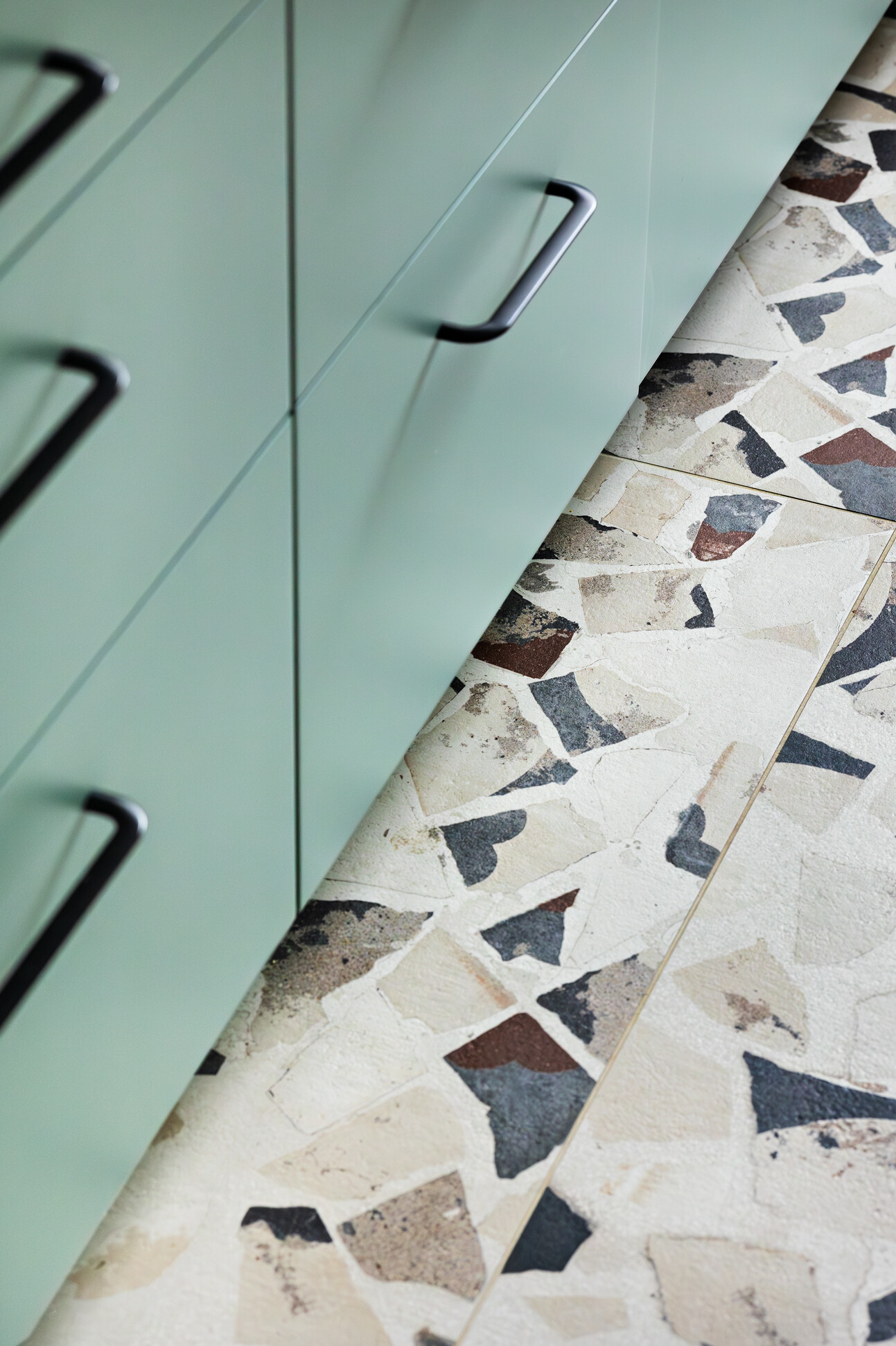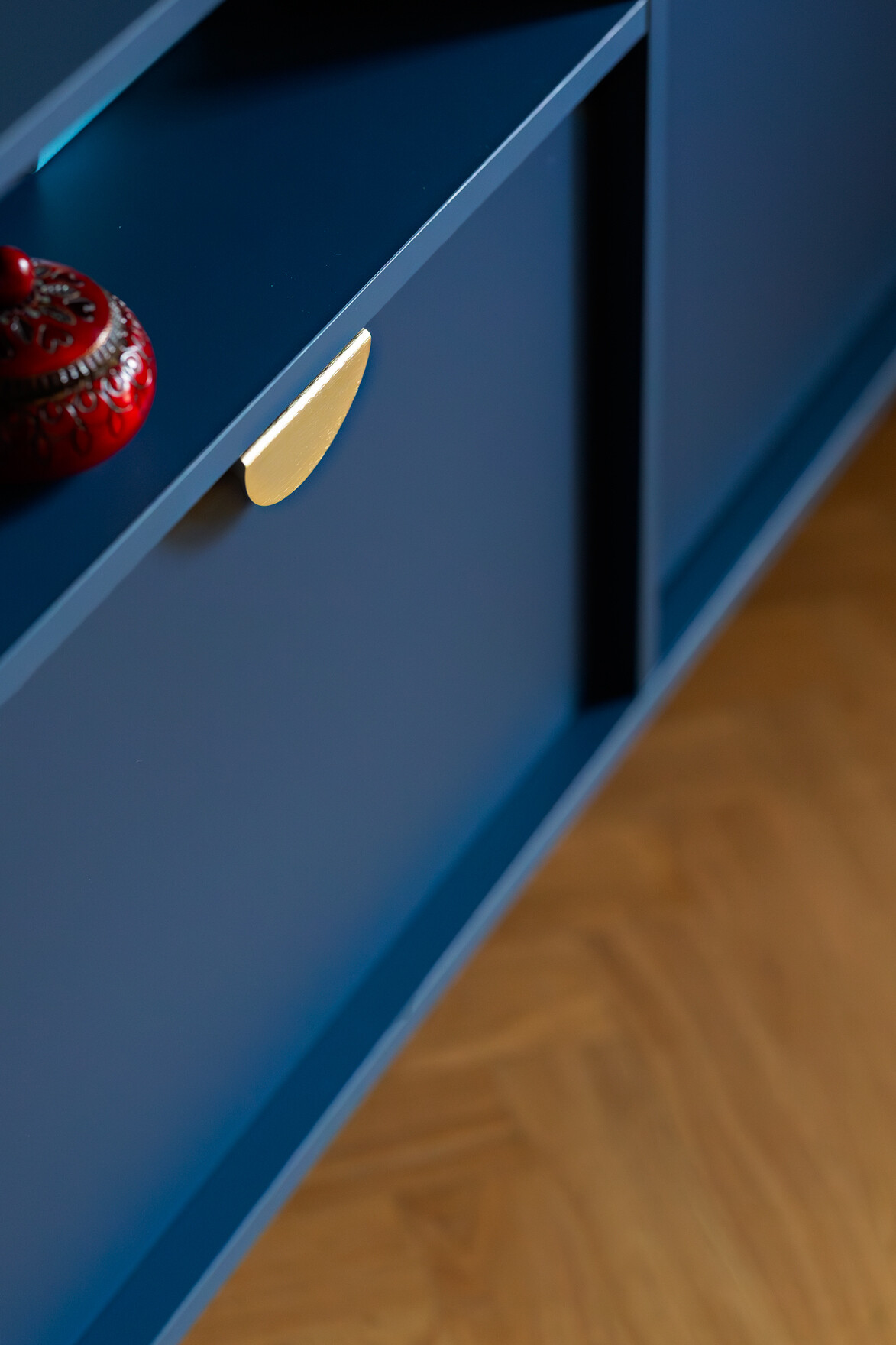 Wyróżnikiem tej realizacji są wzory, które konsekwentnie pojawiają się we wszystkich pomieszczeniach – w pokojach w tapetach i usłojeniu drewna, w kuchni w podłodze i rytmicznym rysunku płytek ściennych. Na podłodze w pokojach położono dębowy parkiet ułożony w jodełkę, który stanowi wyrazistą bazę materiałową dla aranżacji.
